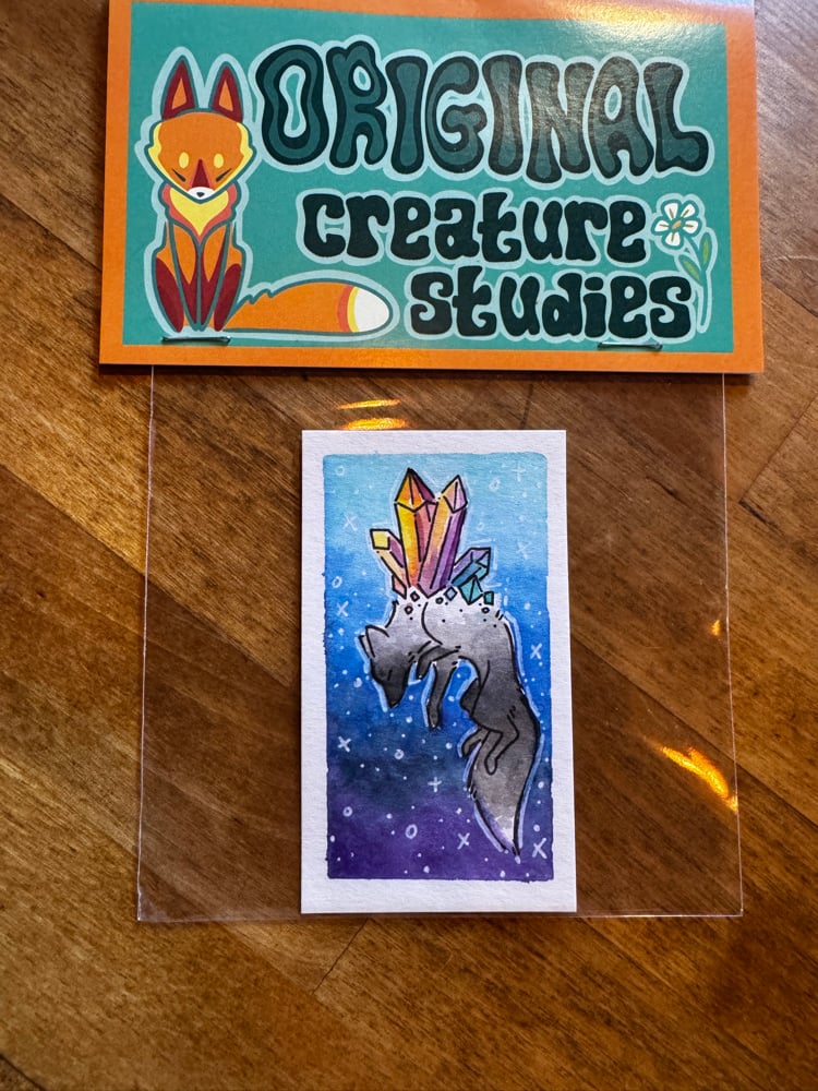 This is a miniature, original painting made with watercolor, ink and whimsy.