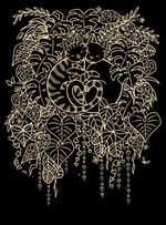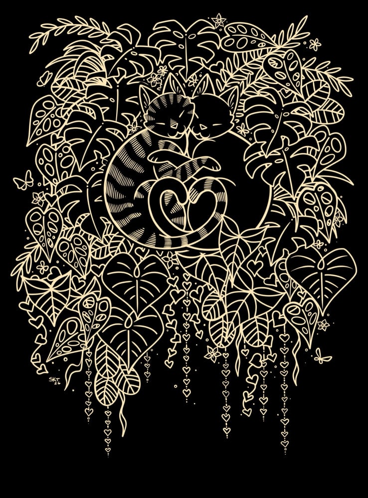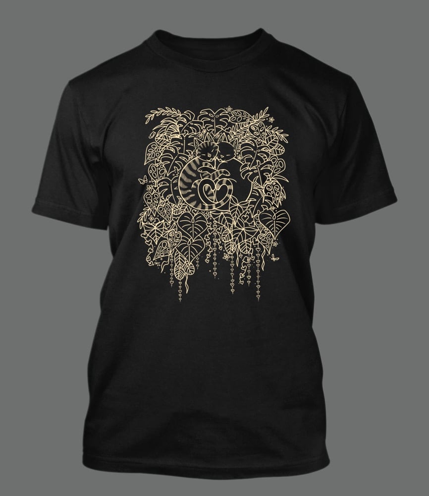 This ‘Felines and Philodendrons' design will be printed on a soft, cotton unisex Tshirt that is black in color.
