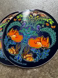 This listing is for a pair of stickers featuring an illustration of foxes, starlings, rabbits and an owl in harmony.
