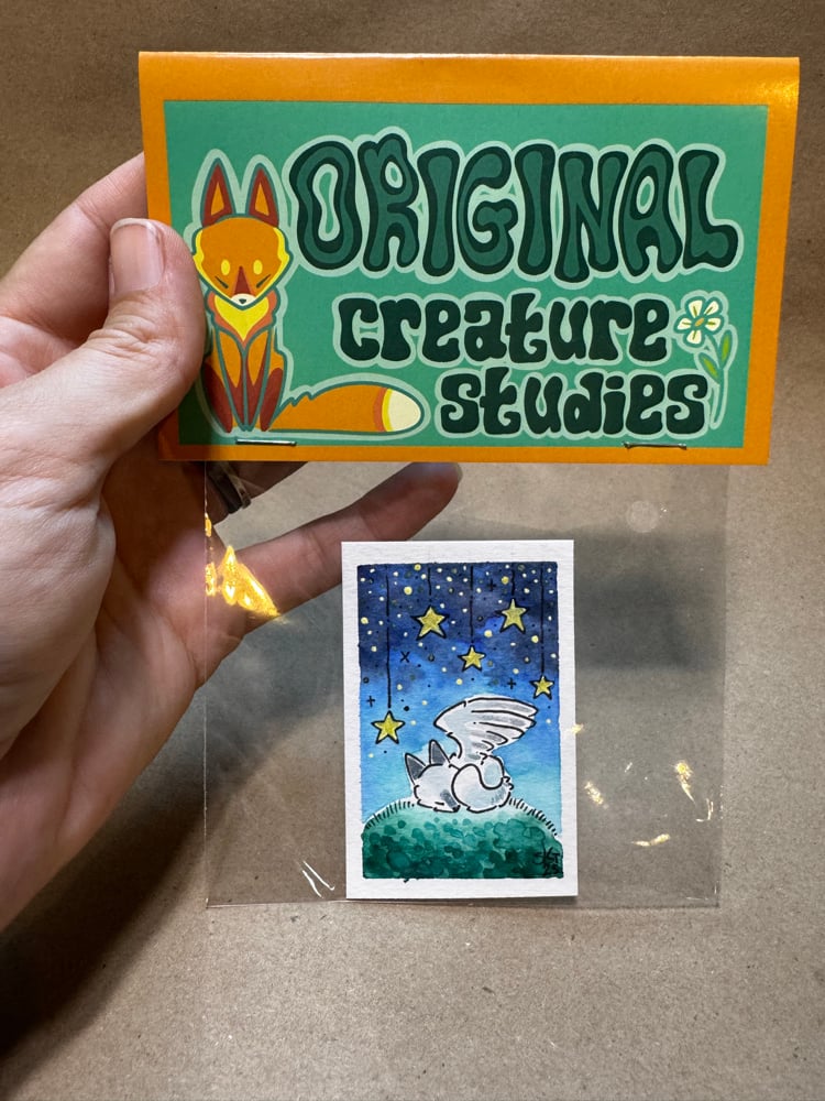This is a miniature, original painting made with watercolor, ink and whimsy.